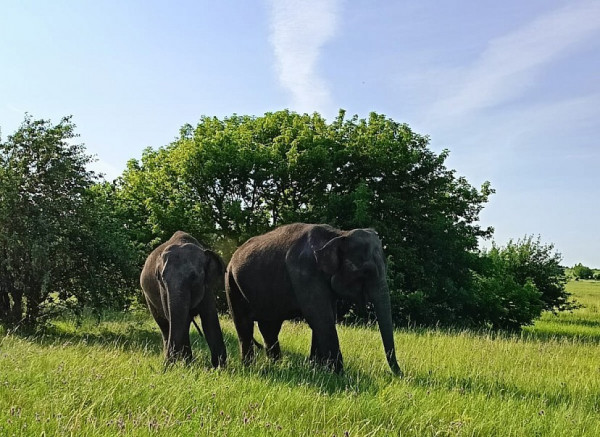 Очевидцы заметили трех слонов около села Терса у федеральной трассы "Сызрань - Саратов - Волгоград". Животные щипали травку и принимали угощения.