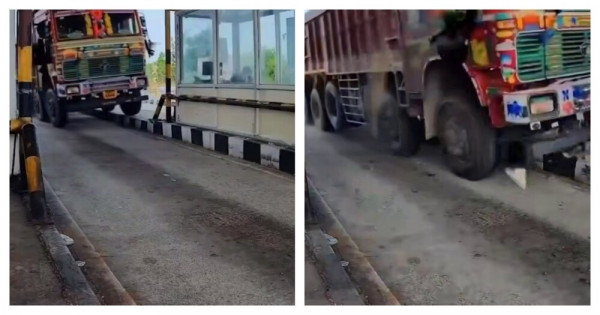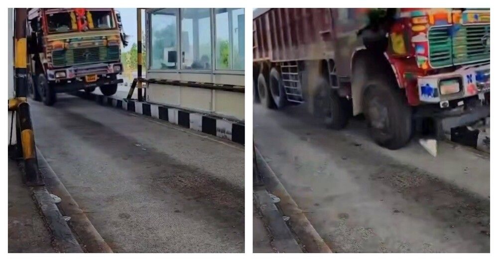 Нетрезвый водитель грузовика влетел в пункт взимания платы на трассе в Индии. В результате столкновения один из сотрудников получил травмы, а стоявшая рядом машина была серьёзно повреждена.