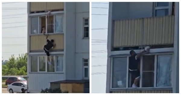 Мужчина пришёл на помощь ребенку, который едва не упал с третьего этажа. Кадры спасения появились в сети