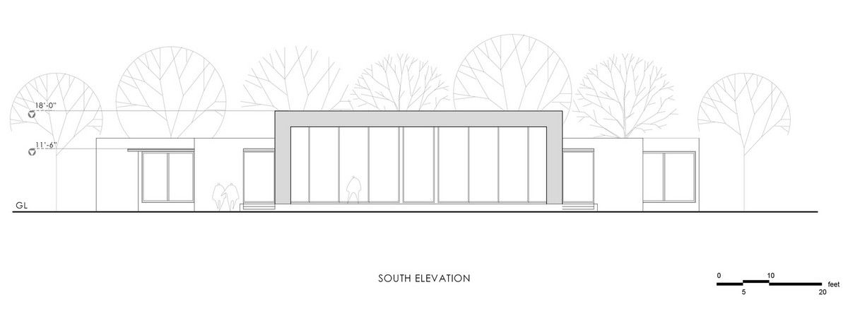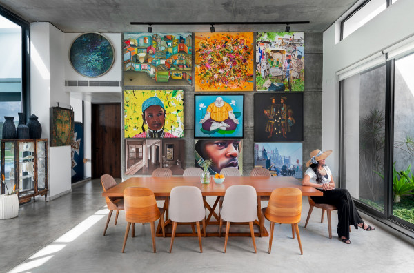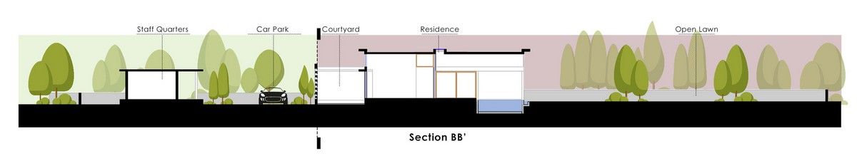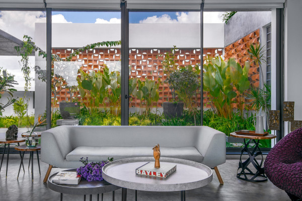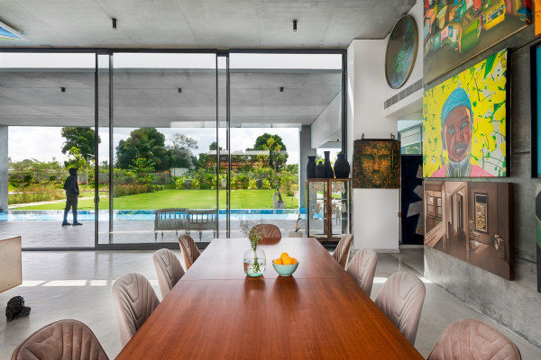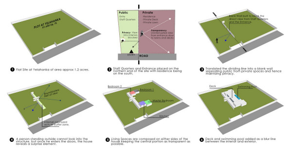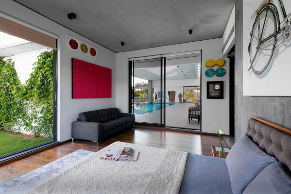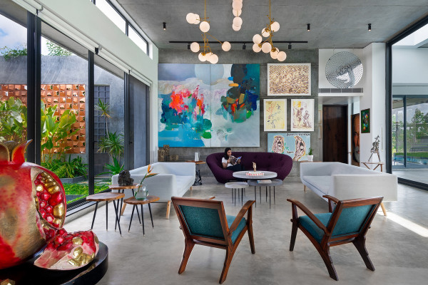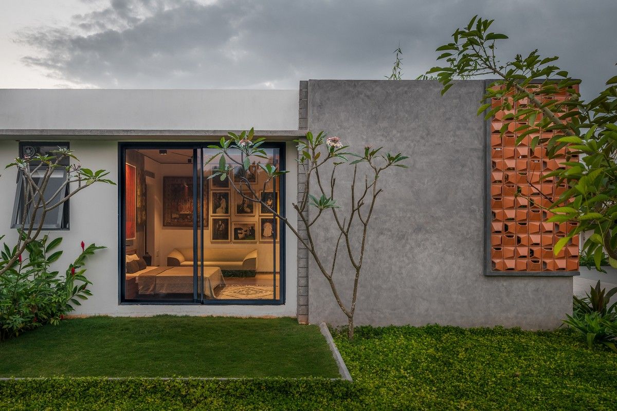 Все материалы, использованные в этом дизайне, являются открытыми и "сырыми", что демонстрирует их искренний характер. Около 80% внешней поверхности этой конструкции - стекло. Это было сделано для того, чтобы размыть грань между "внутри" и "на улице". Для достижения этого эффекта потребовались большие бесшовные панели из стекла, что стало возможным благодаря использованию сверхпрочных алюминиевых рам с тонким профилем., в результате чего алюминиевая рама была практически незаметна. Большинство стен остались незащищенными после оштукатуривания и ручной полировки. Потолок оставили открытым, а для пола использовали оксидную отделку. Чтобы объединить все эти материалы/отделки и придать каждому из них необходимый контраст, некоторые поверхности стен были окрашены в белый цвет. Глиняные джаали на входной стене нарушили монотонность, а также сохранили уединение в остальном прозрачном доме. Джаали также следили за тем, чтобы воздушный поток не нарушался.Пространства должны быть чистыми и незагромождёнными, чтобы создавать ощущение открытости. Это, наряду с большими окнами, делает структуру прозрачной и почти незаметной, придавая особое значение "искусству", которое в ней находится, и окружающему ландшафту. Дизайн конструкции позволяет солнцу и окружающей среде пробуждаться, днём и ночью структура вдыхает жизнь в свой контекст.