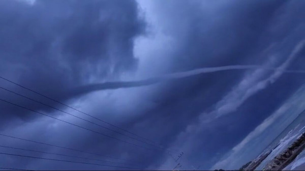 Верхнюю часть вихря исказил сильный ветер. В итоге стандартный вертикальный смерч начал превращаться в горизонтальный.