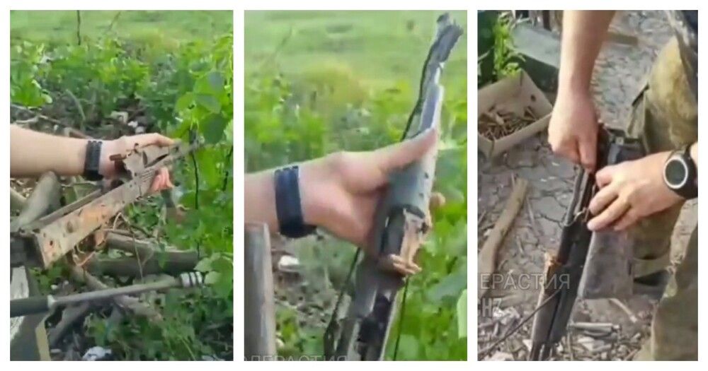 Солдаты нашли автомат Калашникова в крайне плачевном на вид состоянии. Однако они не стали спешить с выводами. Один из мужчин постучал по автомату топориком, вставил "пружинку" и попробовал сделать выстрел.
