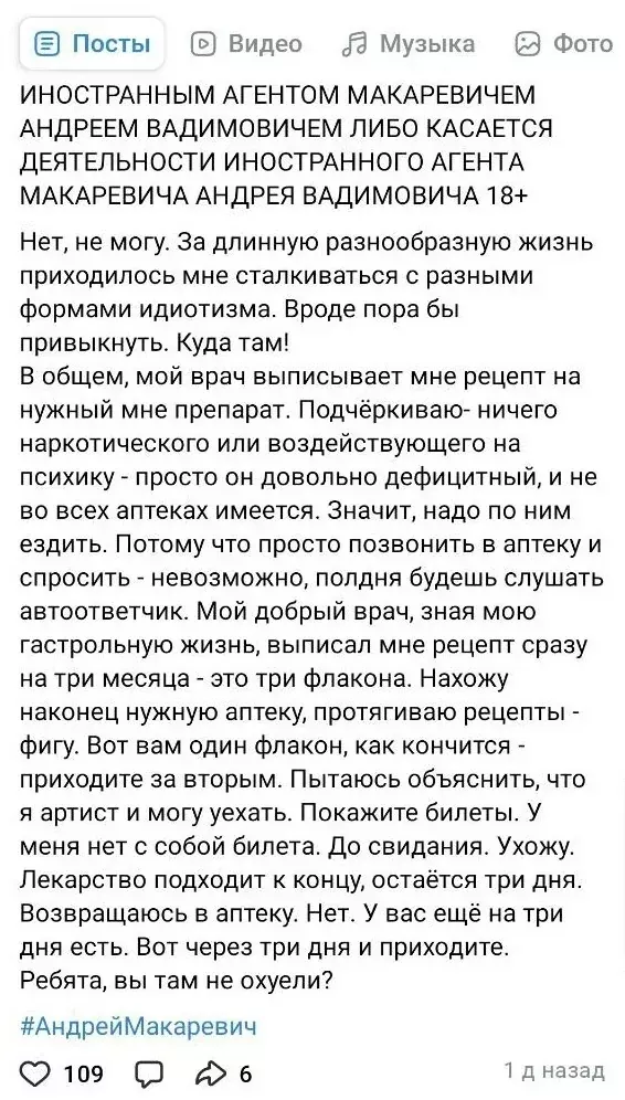 Ранее он критиковал сотрудников почты, потерявших его посылку. *Физическое лицо, выполняющее функции иноагента.
