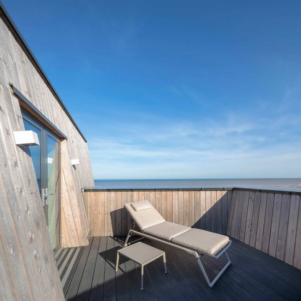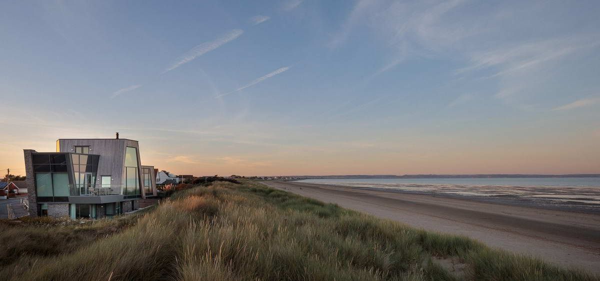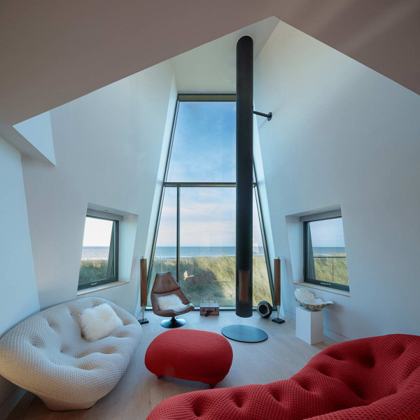 Внутренние помещения состоят из гостиной и главной спальни на первом этаже; консольный балкон на первом этаже возвышается над дюнами, выходя на пляж и пролегающий за ним Ла-Манш. Собственная терраса расположена на уровне мезонина, а дополнительные спальни на втором этаже в более интимной обстановке под дюнами. Фасад на набережную подчеркивает жилую зону двойной высоты с большим усеченным треугольным окном, выходящим на море. Наклонный профиль жилого помещения с внешней деревянной обшивкой перекликается с перевернутыми корпусами кораблей, которые постоянно видны на горизонте.