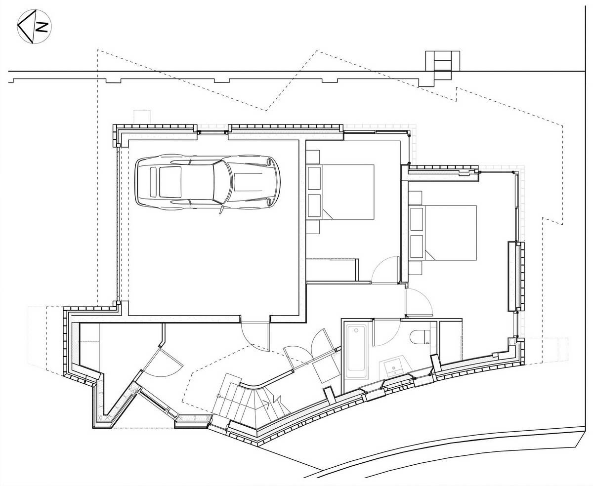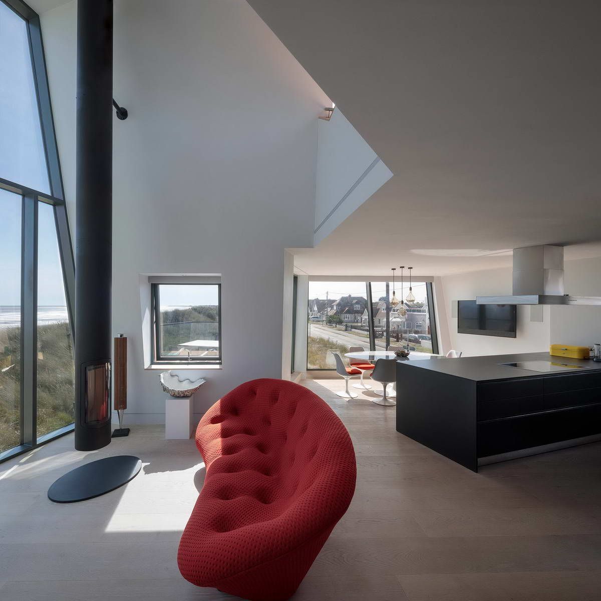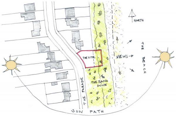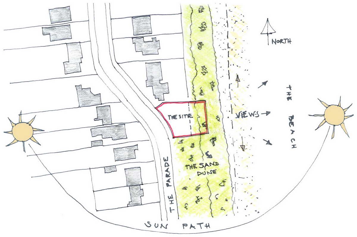 Участок расположен рядом с песчаными дюнами в районе выдающейся природной красоты, на повороте длинной набережной, в конце полосы отдельно стоящих домов на берегу моря, построенных с середины прошлого века до наших дней. Дизайн создает динамическую конфигурацию, направленную на обеспечение различных пространственных ощущений при перемещении по зданию и вокруг него. План и вертикальные формы состоят из усечённых треугольников, которые перекрываются, образуя неправильные ромбовидные формы, которые совпадают с основными видами на этот уникальный морской пейзаж. Хотя участок относительно большой и простирается до верхней отметки, фактическая площадь застройки была ограничена, что усложнялось необходимостью парковки и поворота на уровне первого этажа.