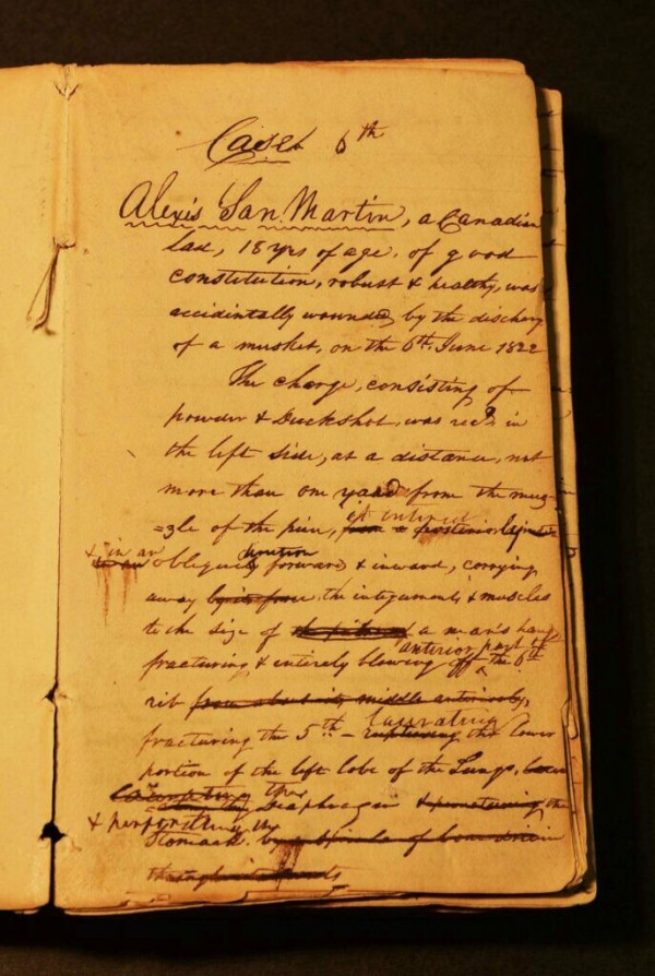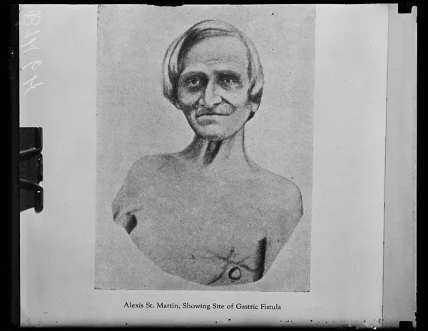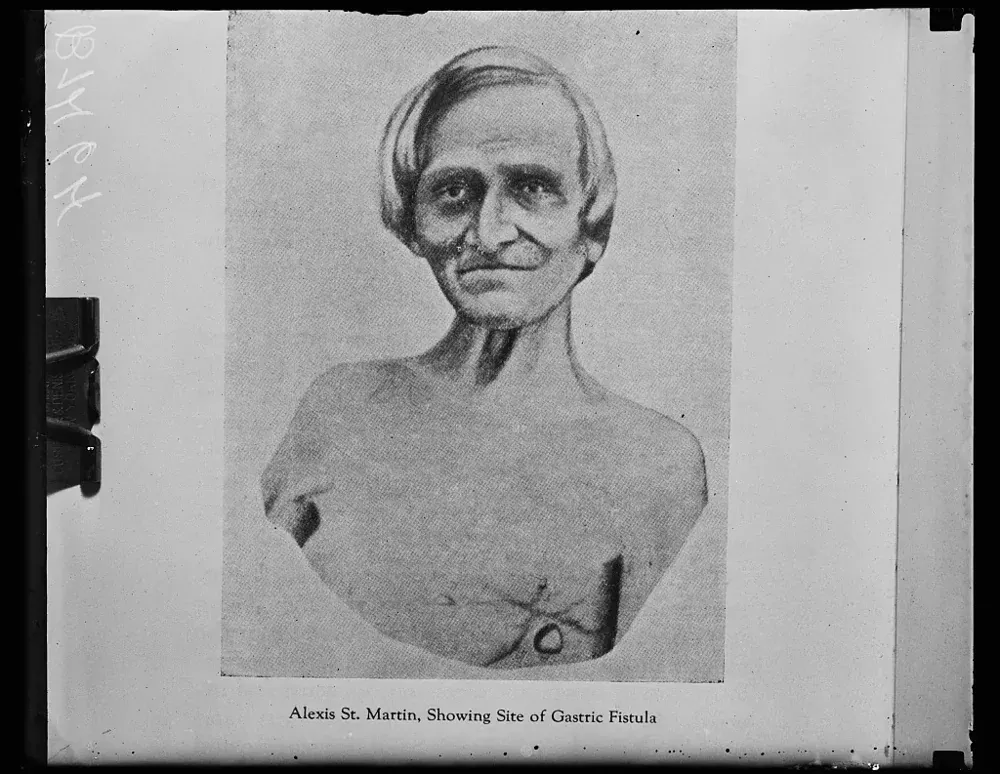 28-летний канадский зверолов Алексис Сен-Мартин случайно выстрелил себе в живот из охотничьего ружья. Заряд дроби пробил ему левое подреберье, сломал два ребра, повредил лёгкое и оставил дыру в желудке. Когда Бомонт прибыл на место, он увидел, что из раны торчат куски лёгкого и желудка, а полупереваренная пища вытекает наружу.