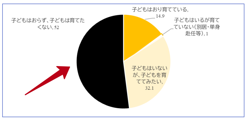 Опрос, проведенный исследовательской группой из Университета Японии, собрал ответы 4000 молодых людей онлайн по всей стране, причем все респонденты были в возрасте от 15 до 39 лет. 14,9% респондентов заявили, что у них есть дети, 32,1% заявили, что у них нет детей, но они хотят их. Однако целых 52% заявили, что у них их нет, и они не хотят их.