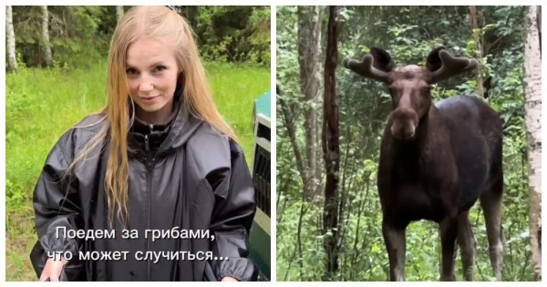 Влюбленная пара отправилась в лес на тихую охоту, предвкушая лукошко, полное грибов. Но вместо этого им встретился хозяин леса - могучий лось, чья морда выражала недвусмысленное предупреждение.
