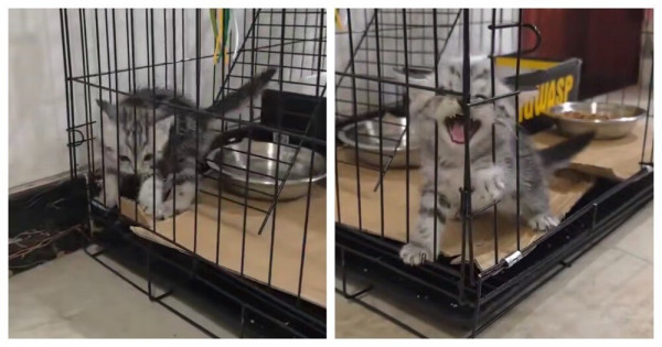 Котёнок пытался выбраться из клетки и громко возмущался. Малыш не догадывался, что дверь в клетку всё это время была открыта.