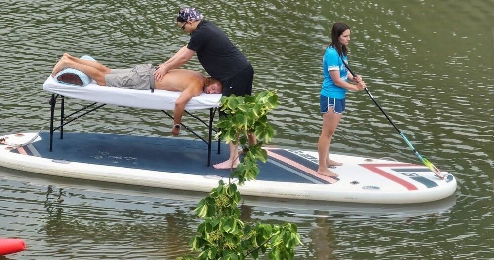 В Новосибирске люди катались на сапе вместе с массажистом и массажным столиком. Сперва это был просто забавный видеоролик, но пользователям сети идея так понравилась, что теперь массаж предлагают в качестве услуги за деньги.