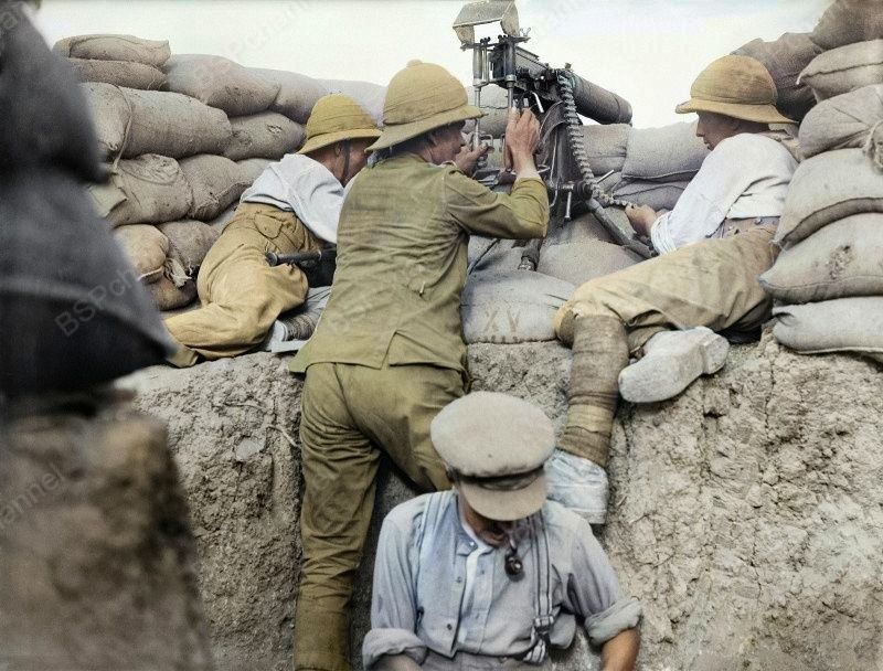 Британский пулемётный расчёт на позиции. Галлиполи, Турция, 1915 год.