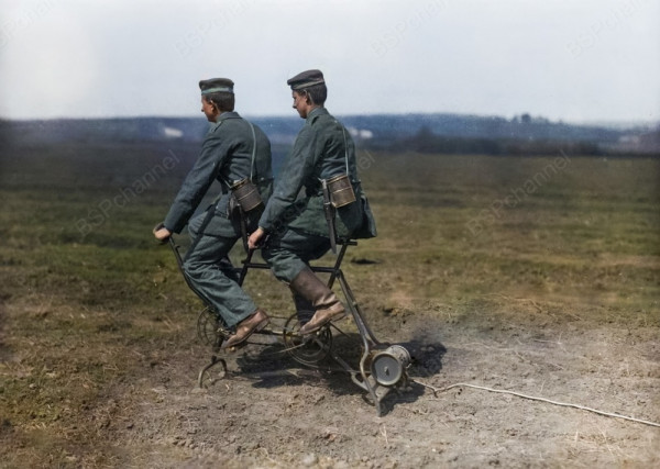 Немецкое изобретение для наполнения аэростата, путем выработки энергии с помощью переоборудованного велосипеда-тандема. Первая Мировая, 1914 год.