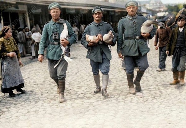Немецкие солдаты возвращаются с рынка в Вильнюсе с гусями. Первая мировая, 1915 год.