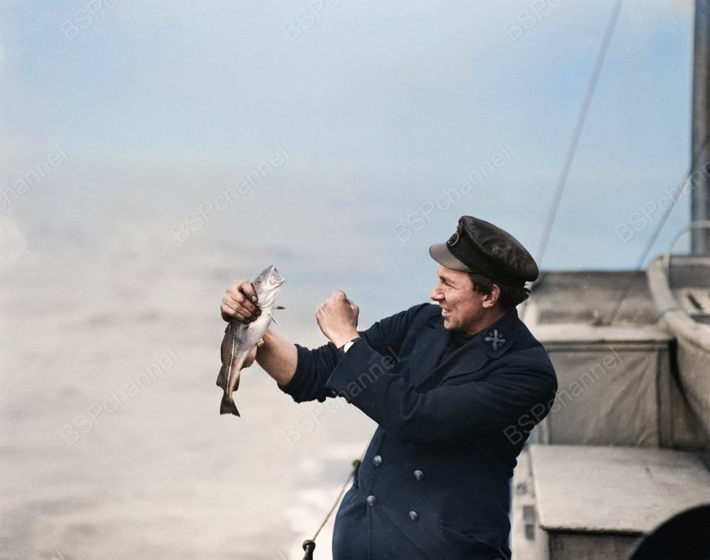 Матрос позирует с рыбой, оглушенный взрывом глубинной бомбы в Харвиче, Эссекс, 15 апреля 1918 года.