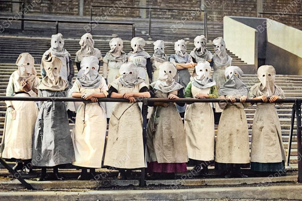 Трибуны футбольного стадиона "Тоттенхэм Хотспур" превратились в мастерскую по производству противогазов, шлемов и другого защитного снаряжения. Первая мировая война. Июль, 1916 года.