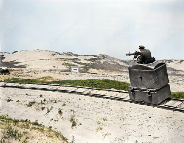 Курсант Королевского летного корпуса отрабатывает стрельбу на отклонение с движущейся платформы, установленной на рельсах и запущенной на высокой скорости. Египет, 1918 год.