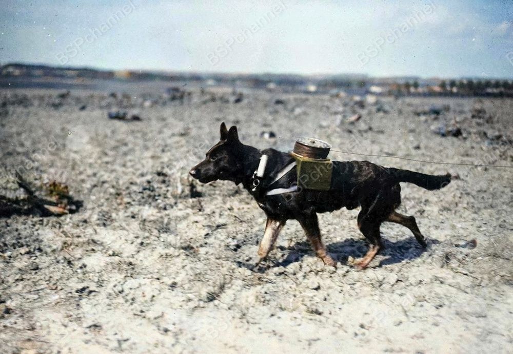 Собака-связной с катушкой прокладывает новую линию. Первая Мировая, сентябрь 1917 года.