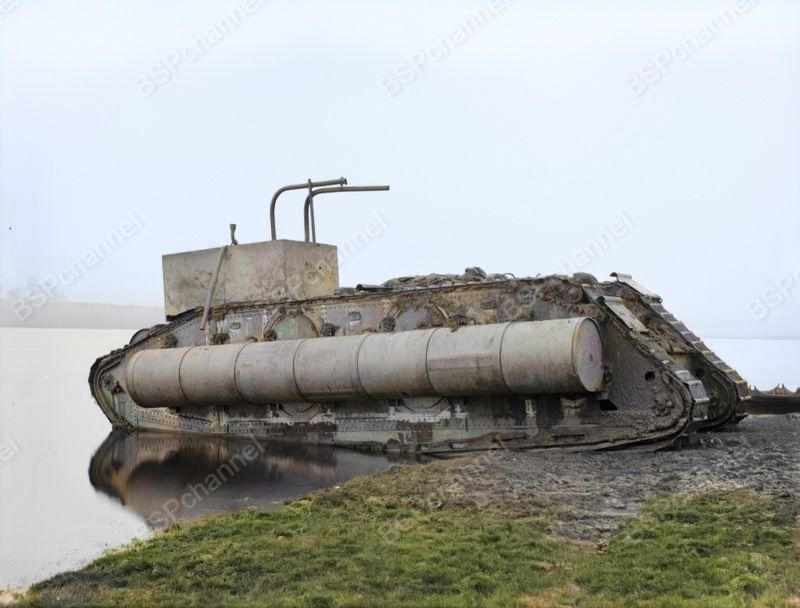 Экспериментальный и единственный амфибийный танк Mark IX заезжает в водохранилище, 1918 год.