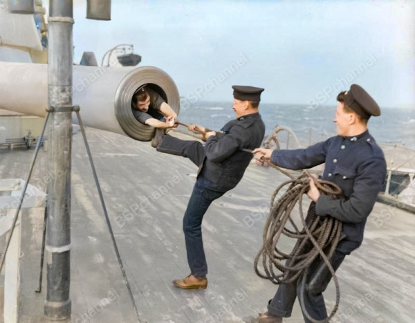 Королевские морские пехотинцы протаскивают человека через 15-дюймовое орудие. Иногда это было необходимо для чистки нарезов. Первая Мировая война, 1916 год.
