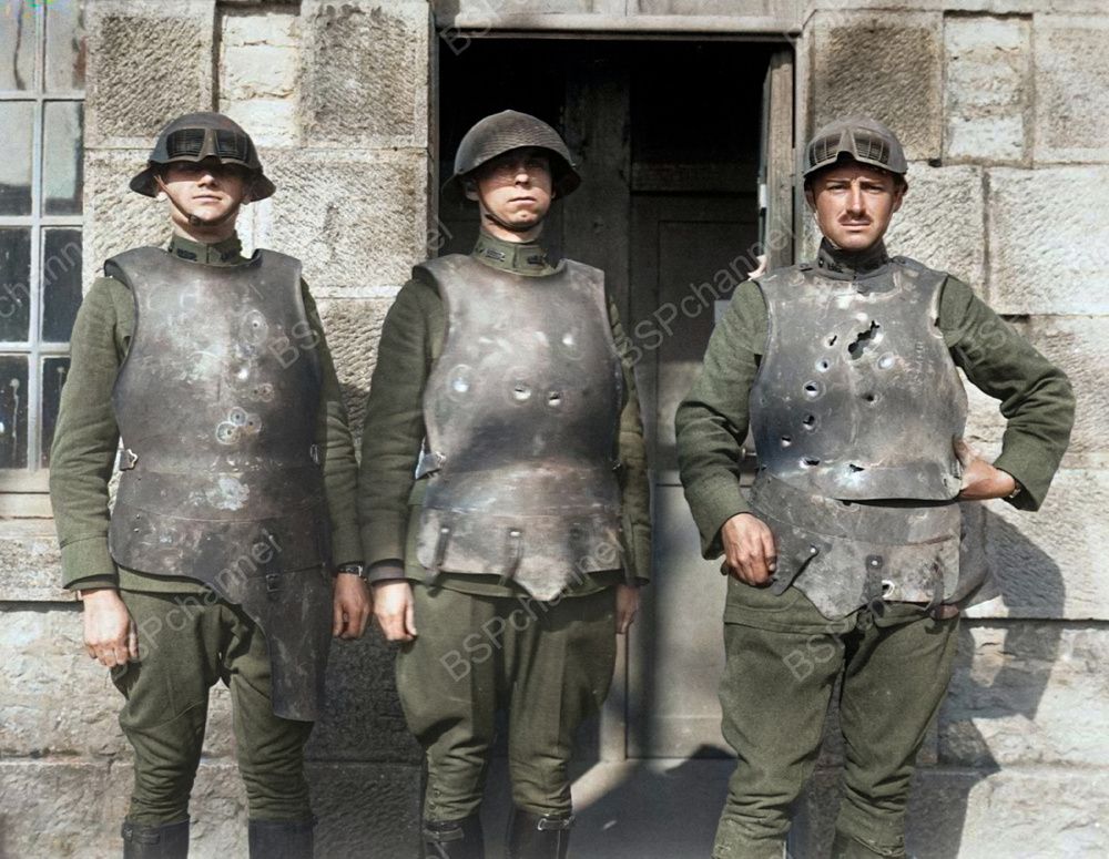 Битва за хребет Пилькем. Три ирландских гвардейца в немецких бронежилетах осматривают захваченный немецкий пулемет. Пилькем, 31 июля 1917 года.