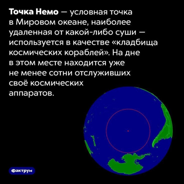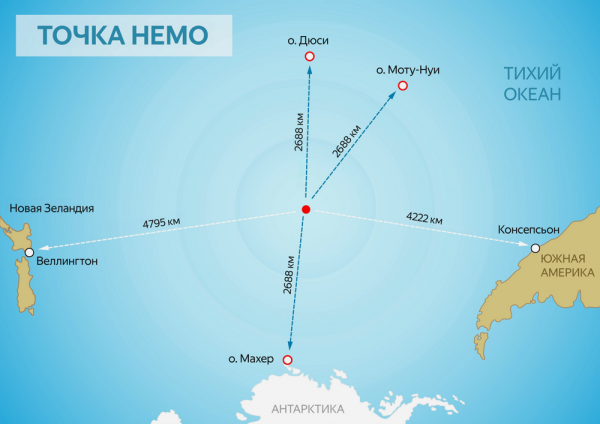 Что такое точка НемоТочка Немо считается самым далеко расположенным от побережья местом на планете. До ближайшего участка суши - больше 2500 км. Точкой её называют скорее условно, на самом деле это участок, который занимает около 37 млн м². Чтобы был понятен масштаб, стоит сказать, что это примерно как две России.Своё название место получило не из-за рыбы-клоуна из одноимённого мультфильма, но художественный замысел тут всё же присутствует. Его назвали в честь капитана Немо из приключенческого романа Жюля Верна "Двадцать тысяч лье под водой", написанного в 1870 году. Кстати, с латинского слово nemo переводится как "никто". Такое название логично и полностью отражает суть Полюса недоступности: долгое время учёные считали, что здесь никто не живёт.Полюс недоступности - более научное название. Если объяснять простыми словами, то это место, максимально удалённое от цивилизации, куда очень сложно добраться. Полюсов недоступности на Земле четыре: континентальный (на севере Китая), на Северном и Южном полюсах и океанический - это и есть точка Немо.