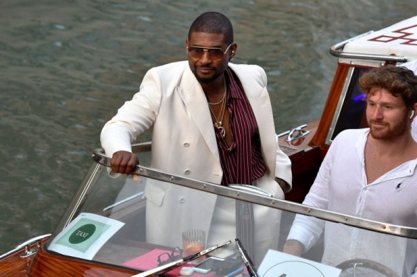 Среди других гостей: Ашер в кремовом костюме и бордовой рубашке с глубоким вырезом, а также Леонардо ДиКаприо, скрывающий лицо под черной кепкой.