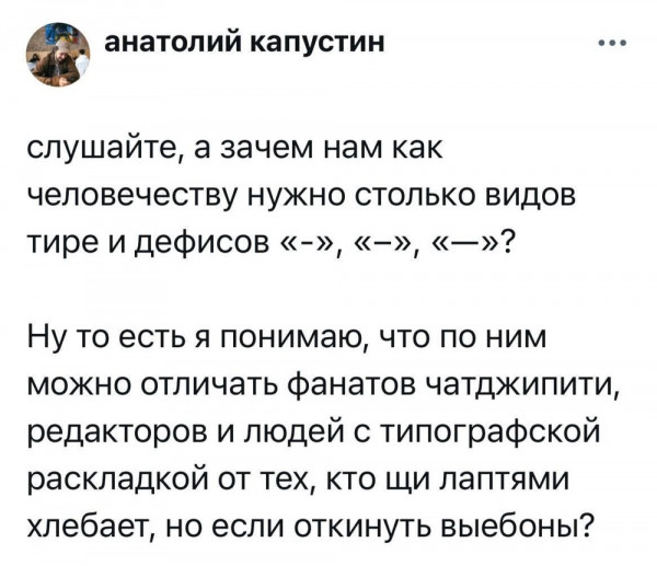 В этой подборке мы вспомним старые анекдоты, расскажем о видах тире, посмотри на очередную шедевральную игру со шрифтами и разберёмся, зачем разводящимся семьям нужен медиатор.