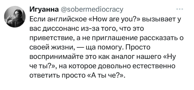 5. Ещё можно заменить на "- Ну как сам-то? - Да потихоньку."