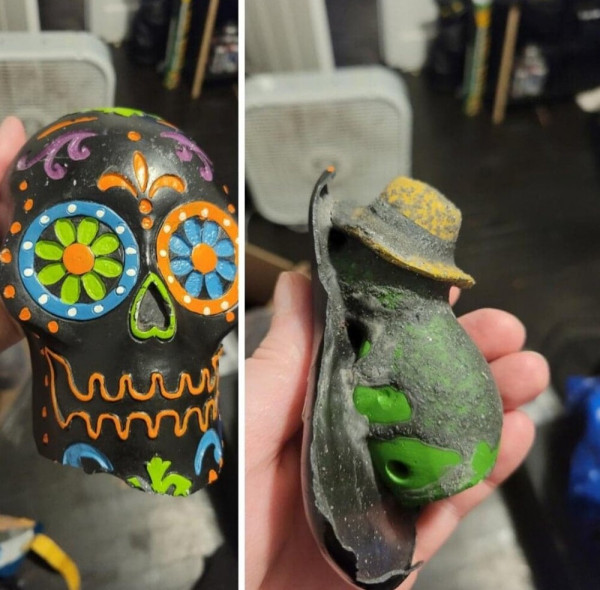 Мужчина приобрел супермаркете сахарный череп. Но он поломался, а внутри что-то непонятное. Такое ощущение, что-то силуэт земноводного в шляпе.