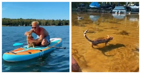 Кот отправился в небольшой отпуск со своими хозяевами. Питомец плавал на сапе, пытался разглядеть "рыбов" в воде и носился по траве на берегу.
