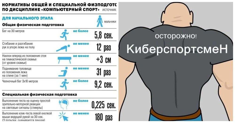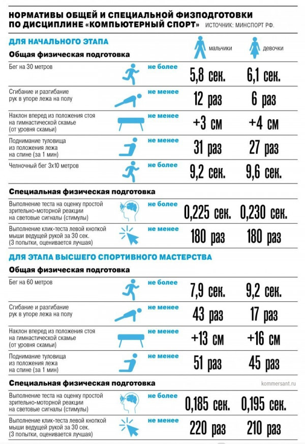 Министерство спорта России разработало и опубликовало новый федеральный стандарт для киберспортсменов. Документ может вступить в силу уже в следующем году. В нём прописаны обязательные нормативы для получения начальной квалификации. Таким образом, чтобы официально стать киберспортсменом, придётся бегать, отжиматься и демонстрировать мощь брюшных мышц. К примеру, в документе присутствуют нормативы по бегу на 30 метров. Это расстояние мальчики должны преодолеть за 5,8 секунду, девочки - за 6,1 секунды. Помимо этого, претенденты на гордое звание киберспортсмена должны отжаться от пола 12 раз (6 раз для девочек), а также совершить не менее 31 подъёма туловища из положения лёжа на спине (27 раз для девочек). Ну и главное клик-тест ведущей рукой - за 30 секунд нажать на левую кнопку мыши не менее 180 раз.А вот для получения звания мастера спорта киберспортсмена придётся "попотеть". Тут нормативы дистанции и количества отжиманий возрастает более чем в два раза. Спортсмены, возможно, посмеются с таких нормативами, но пусть попробуют для начала кликнуть по левой кнопке мыши 220 раз за 30 секунд. "...мужчинам потребуется пробежать 60 метров за 7,9 секунды, сделать 43 отжимания, наклон вперед на 13 см, поднять туловище минимум 51 раз, выполнить тест на реакцию за 0,185 секунды и сделать 220 кликов. Нормативы у женщин: бег 60 метров за 9,2 секунды, 17 отжиманий, наклон на 16 см, поднимание туловища 45 раз, тест на реакцию за 0,195 секунды и 210 кликов", - пишут СМИ.