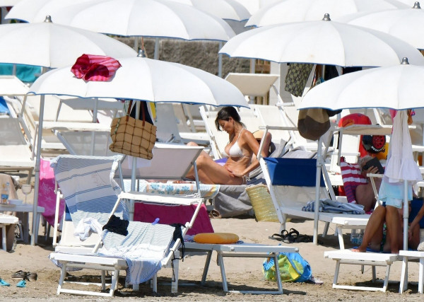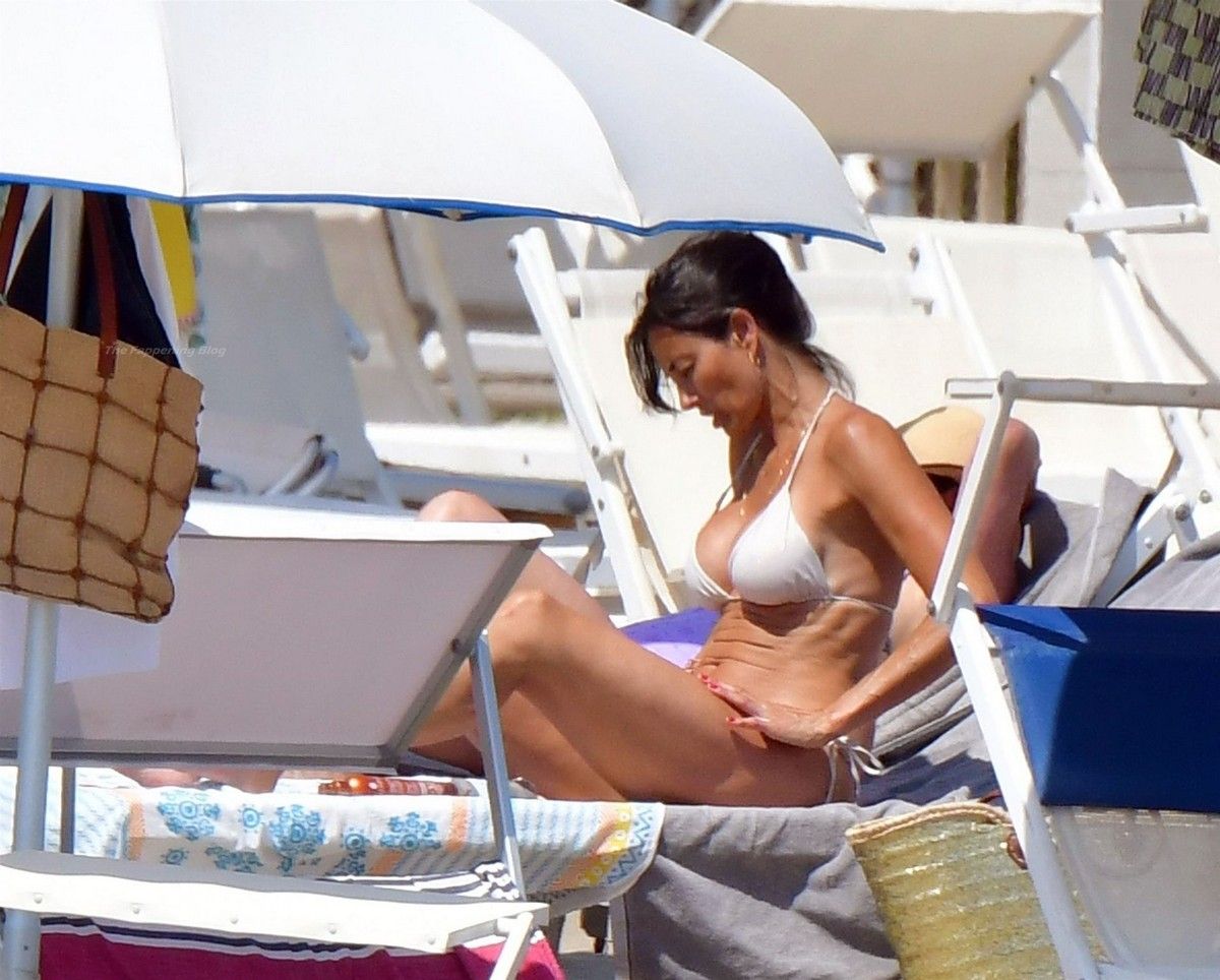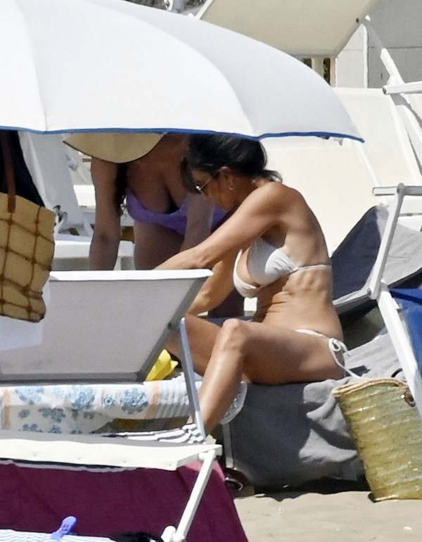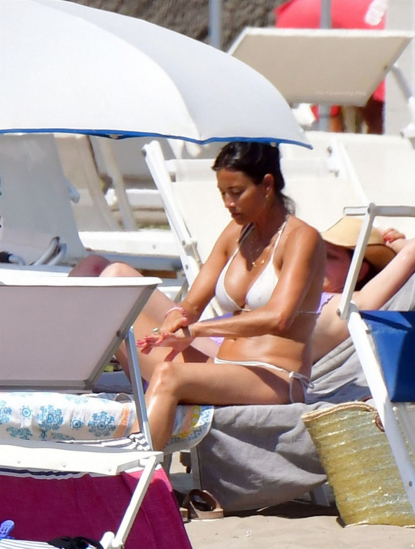 51-летняя британская журналистка, телеведущая, актриса и фотомодель Мелани Сайкс (Melanie Sykes) в бикини на пляже в Лидо, Венеция.