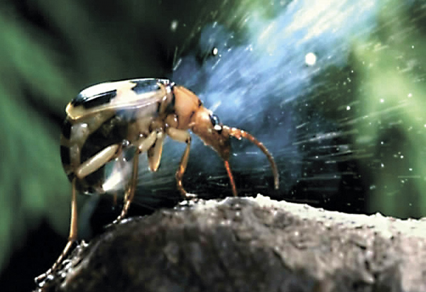 Огонь из пасти. Для начала разберемся с огнем. Он копится в специальных железах. Точнее, не сам огонь, а горячая смесь химических веществ.В момент выстрела температура этой смеси вырастает до 100 °C. Сопровождает выстрел громкий хлопок, а струя бьет точно в цель.Эту способность Змей Горыныч получил от жука бомбардира. Тот довольно эффективно разбирается с помощью "струи огня" даже с очень крупными представителями насекомых. Обычные враги жука - насекомые покрупнее - сгорают заживо в этой жидкости. Ну для его скромных габаритов этого достаточно.