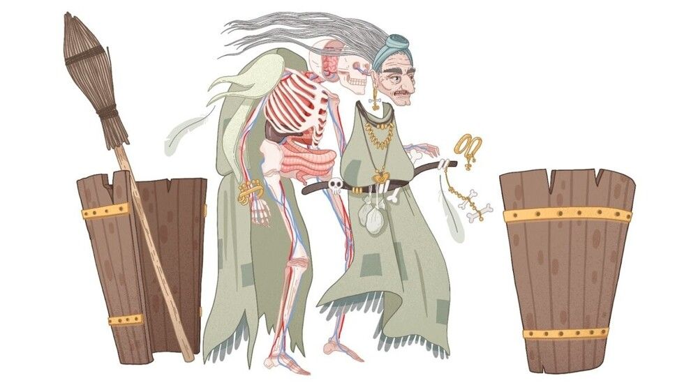 Эксперты "НаукаPRO" считают, что Баба-яга имеет типичную человеческую анатомию с возрастными изменениями. А вот костяная нога - типичные пример патологической аномалии. Горб говорит о букете заболеваний, включая остеохондроз, артрит и радикулит.