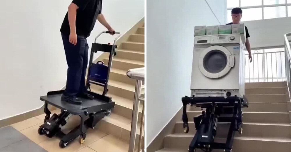 Электроподъёмник, который с легкостью может поднять по лестнице хоть стиральную машину, хоть человека. Заряда аккумулятора хватит примерно на 60-80 этажей.
