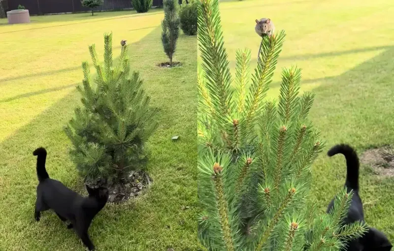 Мышонок, спасаясь от настойчивого преследователя, нашёл неожиданное убежище. Он забрался на самую верхушку ёлки и стал наблюдать за тщетными попытками кота дотянуться до него. Это наглядный пример того, как находчивость и нестандартное мышление могут спасти даже в самой безвыходной ситуации.