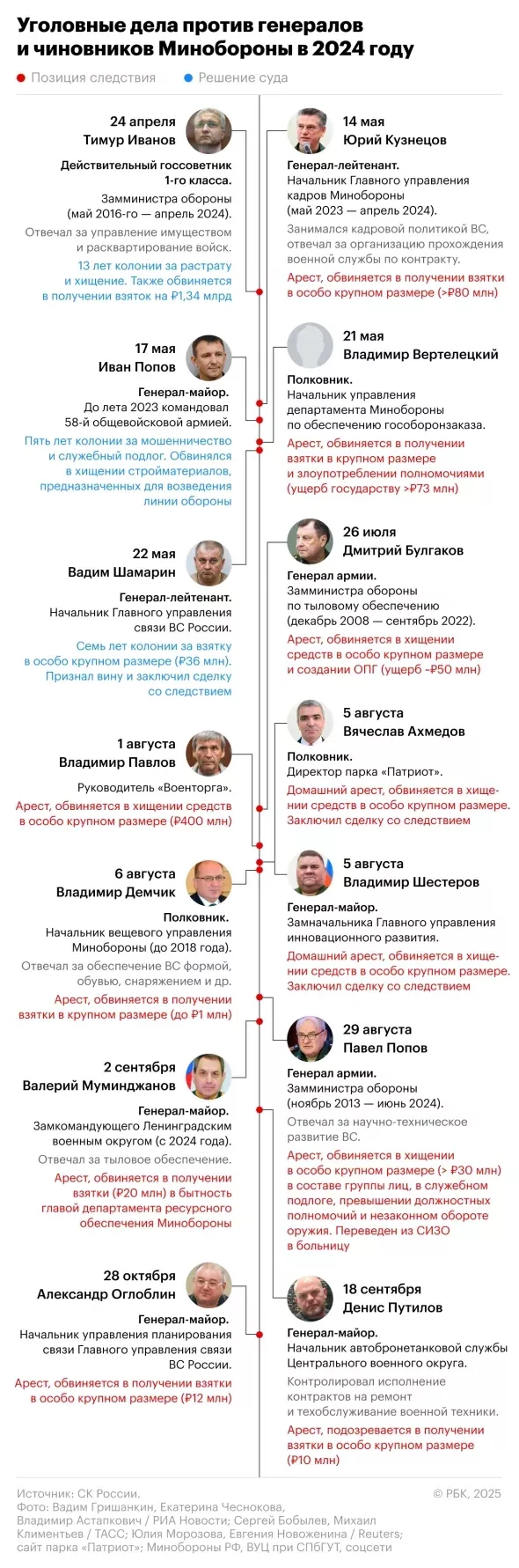 Павел Попов был задержан в августе 2024 года по подозрению в мошенничестве. Экс-гзамлавы Минобороны курировал строительство парка "Патриот", в котором находится храм ВС РФ, По версии следствия Попов вместе с экс-директором парка "Патриот" Вячеславом Ахмедовым и заместителем начальника Главного управления инновационного развития Минобороны России генералом-майором Владимиром Шестеровым распоряжались бюджетными средствами по своему разумению, используя их для личных целей.