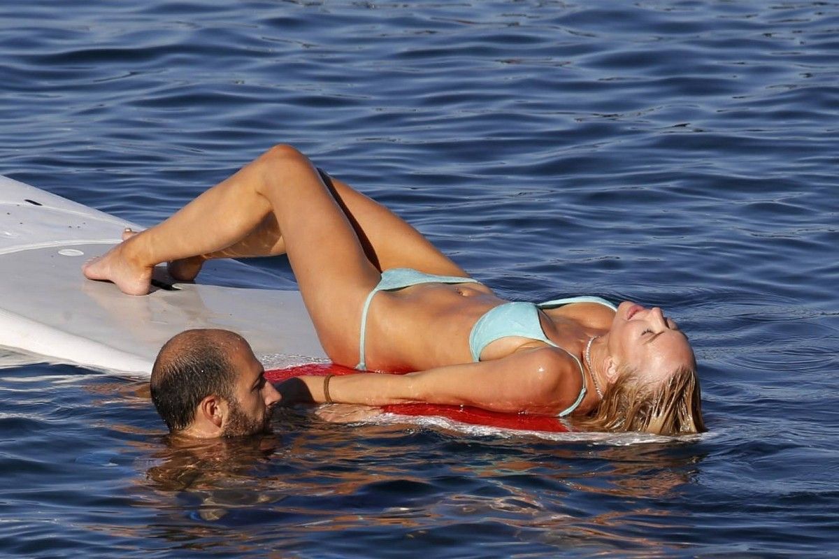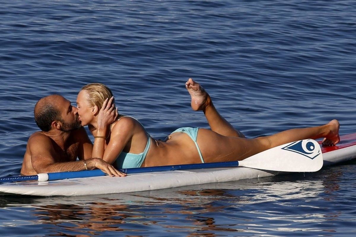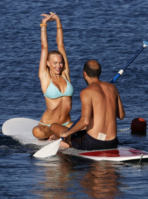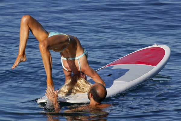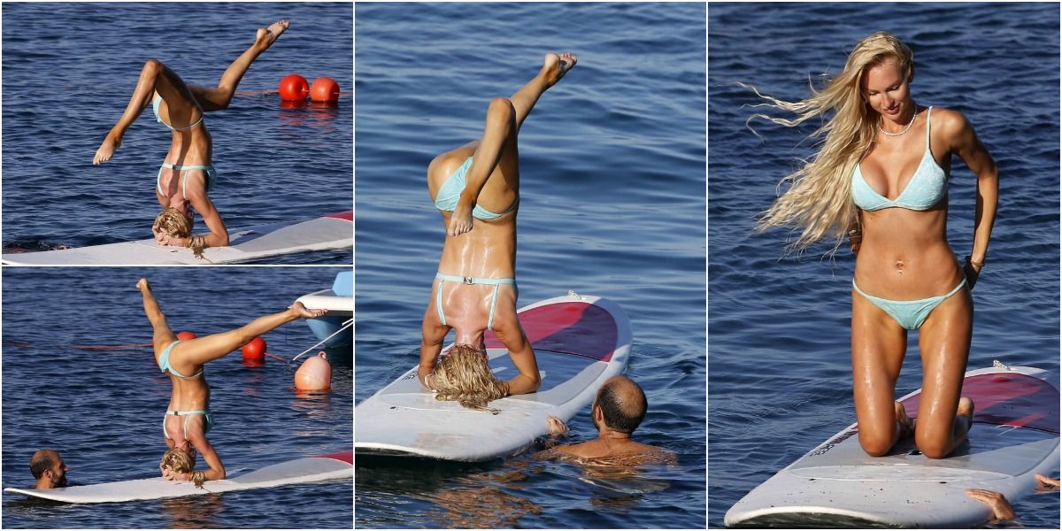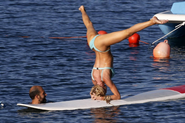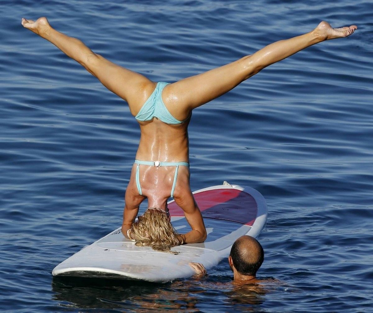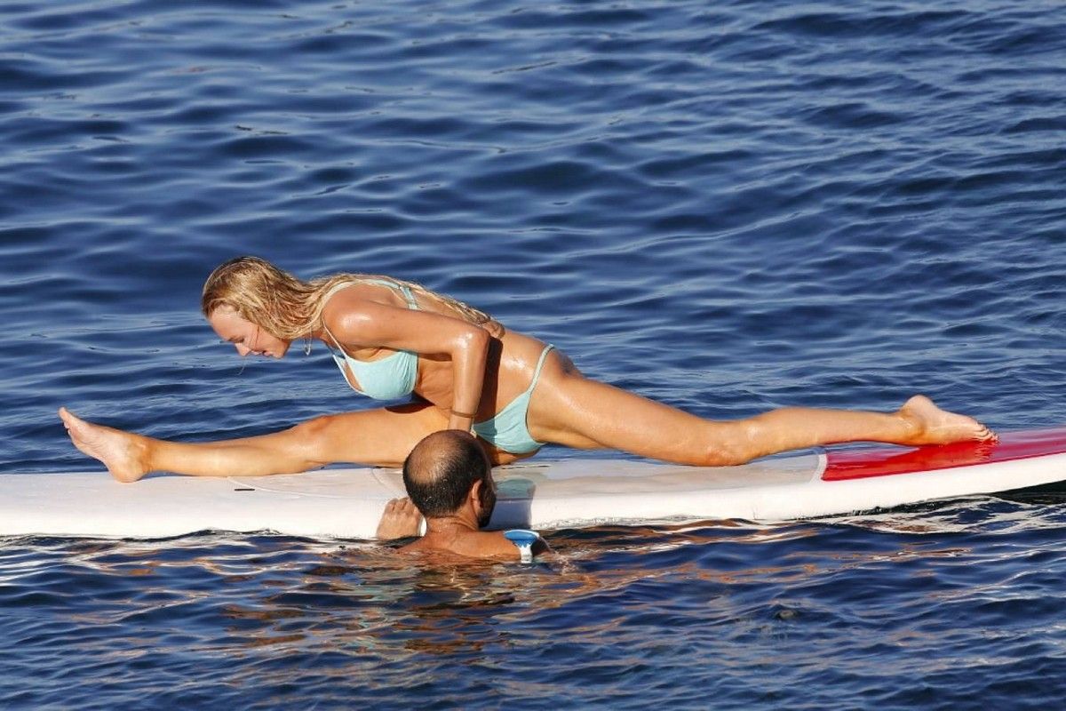 31-летняя американская модель и актриса Кристин Куинн (Christine Quinn) занимается йогой на доске во время отдыха с мужем в Таормине, Италия.