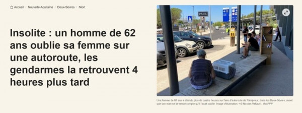 Около 8:30 утра в субботу, 5 июля, в отделение дорожной безопасности департамента Ланд (EDSR) поступил довольно необычный звонок. Сбивчивым голосом мужчина сообщил, что оставил жену на автозаправке, не помня точно, где и когда, по пути из Парижа в Марокко. "Мы получили этот довольно странный звонок около 8:30 утра. Мужчина уже не помнил, где и когда он останавливался", - сообщили жандармы из EDSR Ланд.