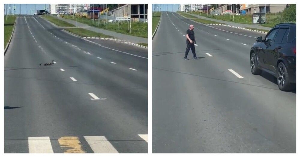 В Пензе мужчина вышел из своего автомобиля, чтобы перевести утиное семейство через дорогу. Он начал махать руками, чтобы водители остановились.
