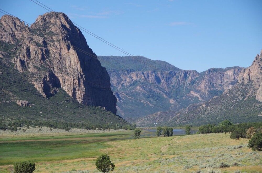 Ручей Ист-Крик течёт на восток, впадая в реку Ганнисон возле городка Уайтуотер, а Уэст-Крик на запад, к реке Долорес у поселения Гейтуэй. Между этими точками каньон протянулся на 70 километров, достигая глубины почти в километр и ширины до 6 километров.
