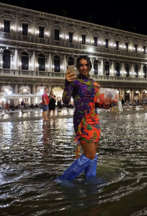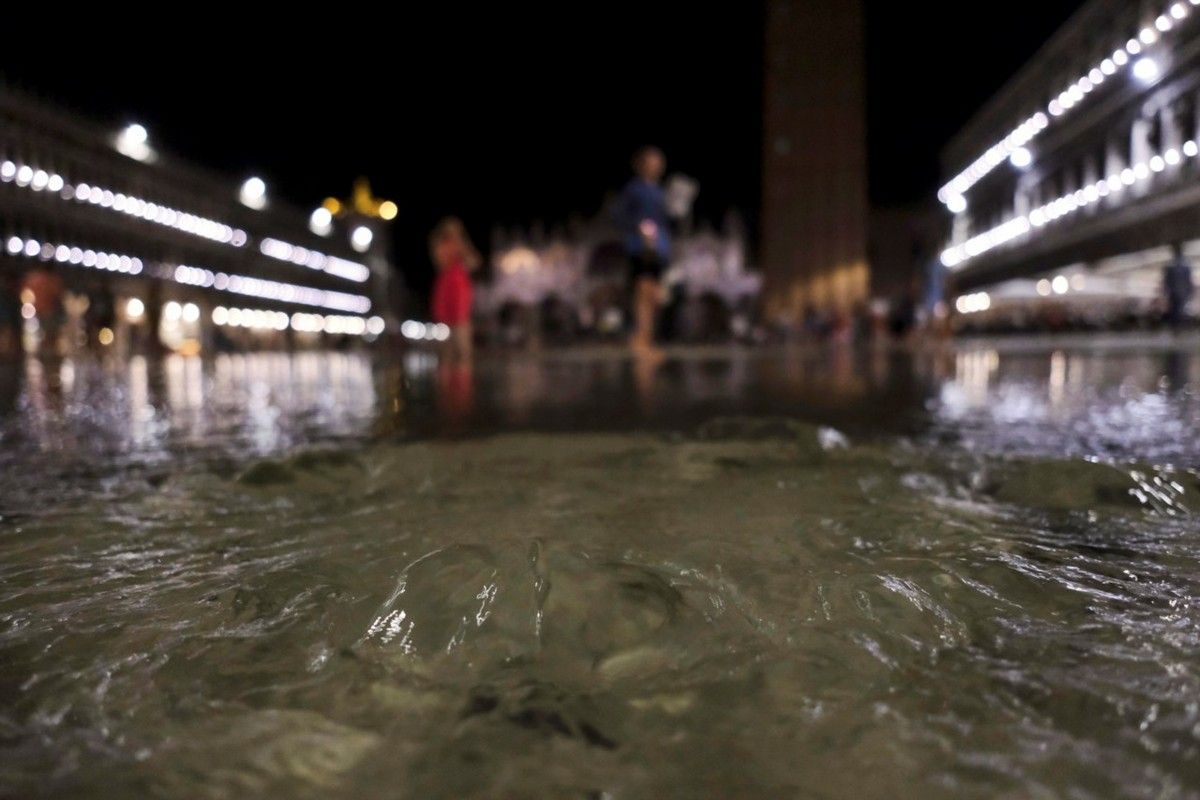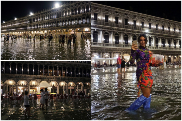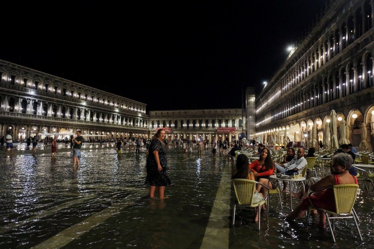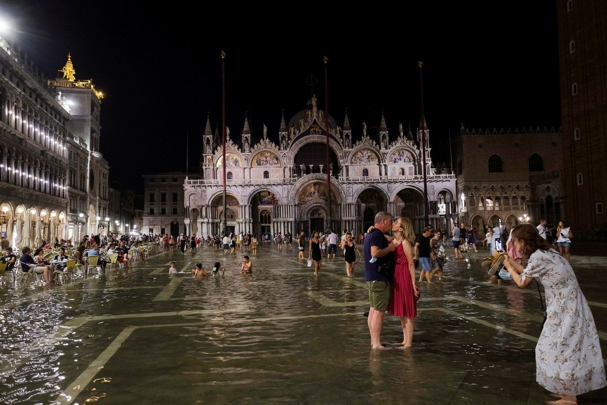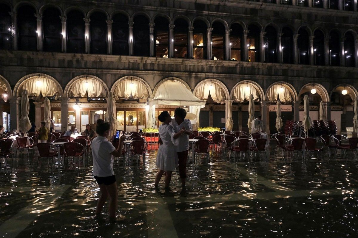 Лагунный город часто страдает от так называемой "аква альта" (половодья) осенью и зимой, а разрушительные наводнения в ноябре 2019 года нанесли ущерб в сотни миллионов евро.Воскресный вечер, однако, был менее разрушительным, и пары на площади танцевали под фортепьянную музыку почти по колено в воде, в то время как дети плескались, а туристы пробирались вброд с ботинками в руках.Инциденты с половодьем в Венеции вызваны сочетанием нескольких факторов, усугубленных изменением климата - от повышения уровня моря и необычно высоких приливов, до оседания суши, которое привело к опусканию уровня земли в городе.В октябре прошлого года впервые был развернут заградительный барьер с длительной задержкой, но он активируется только для блокирования наиболее потенциально опасных приливов более 130 см (4 фута 3 дюйма) и поэтому не был задействован в воскресенье.