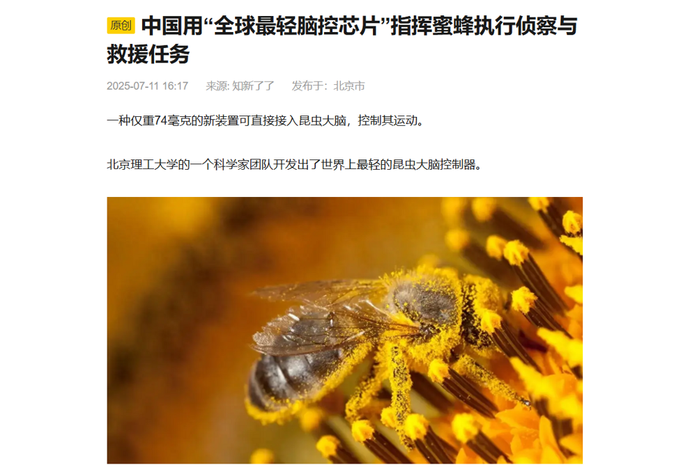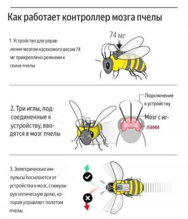 Учёные из Пекинского технологического института подключили к пчёлам 74-мегапиксельный контроллер, который дистанционно управляет их зрительными долями через электрические импульсы.Чтобы создать эту научно-фантастическую систему, команда напечатала схемы на полимерной пленке, которая тонка и гибка, как крыло насекомого, но способна вместить крошечные компьютерные чипы.Результат: насекомые послушно летают "влево-вправо" по команде, словно дроны, но с живыми крыльями. Технология выглядит как сценарий фантастического боевика, но это реальность: насекомые выполняют команды с точностью 90% и могут нести груз тяжелее самих себя.Грузоподъёмность действительно впечатляет, несчастное насекомое может тащить вес до 80% от массы своего тела - идеально для доставки микрочипов или прослушки. Вот только пока с питанием контролера не всё так гладко. Устройство требует проводного питания, а автономные батареи весят 600 мг, что неподъемно для пчелы (батарея в 600 мг для пчелы - как для человека тащить холодильник).