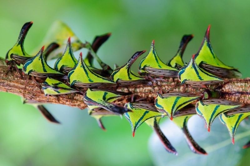 Эта совершенно инопланетная штука на самом деле хитро замаскированная цикадка, хотя по поводу видовой принадлежности этого насекомого учёные продолжают спорить. Умбония спиноза имеет вырост, который напоминает колючку акации или шип розы. Это идеальный камуфляж от птиц. Но самое удивительное, что форма "рога" отличается у разных популяций в зависимости от растений, среди которых они живут. Самка остаётся охранять яйца после кладки, а когда вылупляются личинки - кормит их, прокалывая кору растения, чтобы они пили сок.