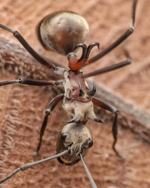 Этот вид муравьёв благодаря острым шипам может блокировать вход в гнездо от врагов, цепляться за листья и висеть вниз головой и прокалывать кожу хищников, как микроскопическим гарпуном.