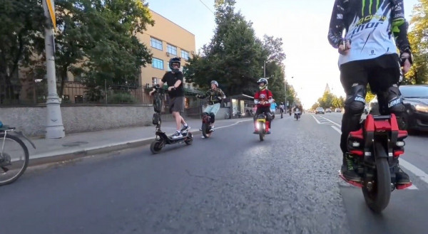 Во время пробега по Москве моноколёсник "нашёл себе пару" в виде водителя электросамоката. Наверное, дальше они будут ездить вдвоём на одном электросамокате