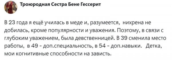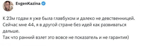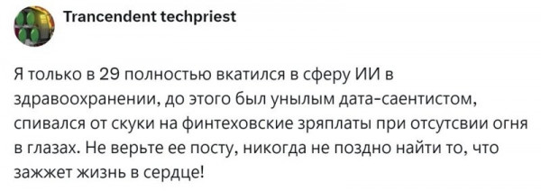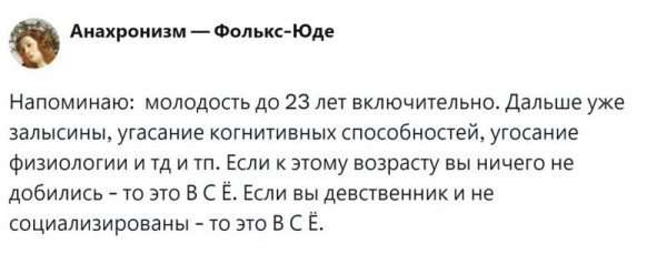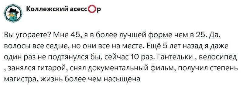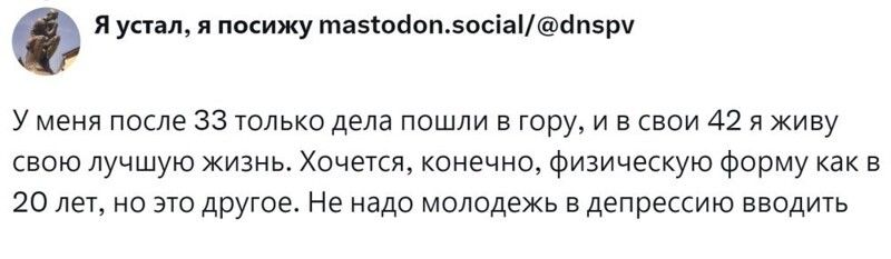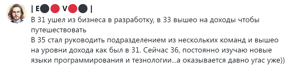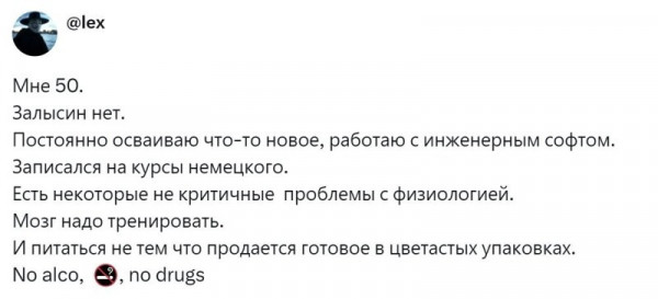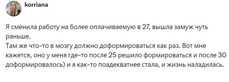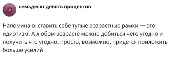 Что логично, поскольку постепенное ослабление когнитивных функций начинается уже после 30-35 лет. Заметные изменения наблюдаются после 45 лет. А после 60 всё уже цветёт пышным цветом. По этому вопросу пользователи в очередной раз сошлись в битве-обсуждении, разделившись на два лагеря. Топикстартер заявил, что лет так после 23 надо заматываться в простыню и ползти в сторону кладбища не отсвечивать, а его оппоненты не согласились и настаивают, что изменить жизнь можно в зрелом возрасте - и язык выучить, и новую профессию освоить, и бизнес запустить, и сложное хобби завести. И после 30-40 лет всё только начинается.