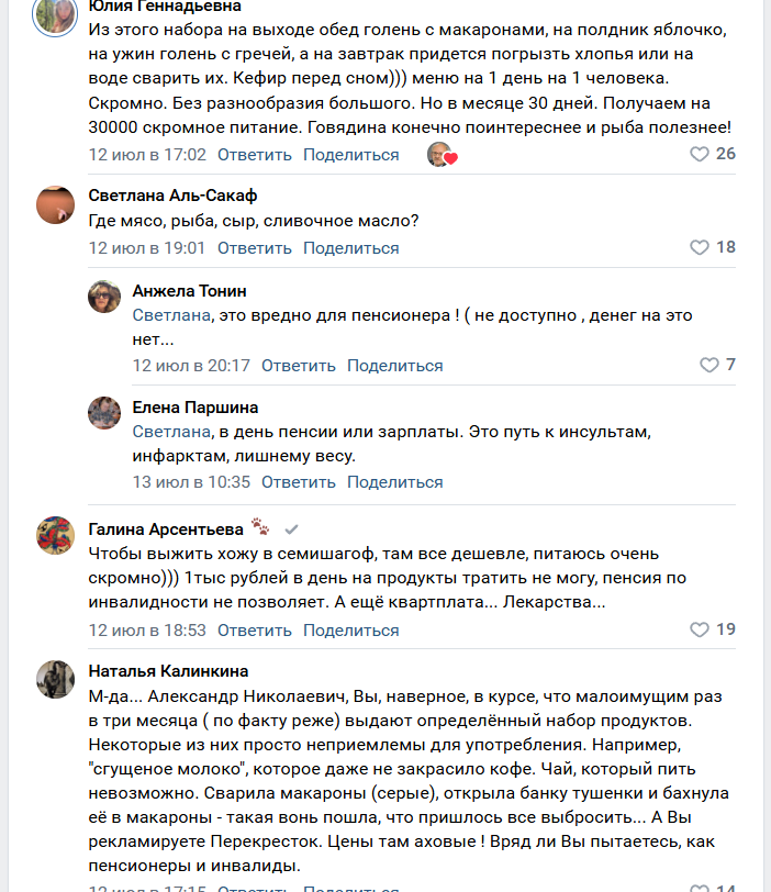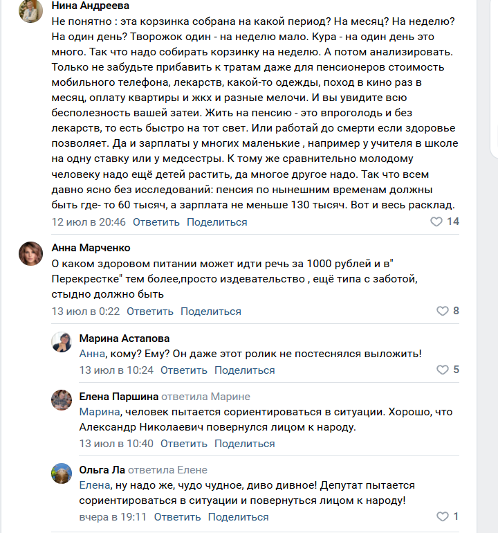 Депутат петербургского парламента от "Единой России" Александр Ржаненков попытался собрать корзину полезных и здоровых продуктов на 1000 рублей. "Недавно мы сняли экспериментальное видео: я пошёл в "Перекрёсток" и собрал продуктовую корзину на 1000 рублей. Задача была следующая: выбрать полезные продукты, которые уложатся в ограниченный бюджет. Никаких излишеств и экзотики - только базовые продукты, на которые ориентируется большинство. На словах - легко, а на деле каждый продукт требовал взвешенного решения. Где-то пришлось делать непростой выбор между овощами и белком, где-то - вспоминать, что точно есть не стоит, даже если дёшево", - прокомментировал Ржаненков свой эксперимент.Он купил гречки, куриную голень, немного овощей и два яблока. Из молочных продуктов в корзине оказались кефир и творог. Еще депутат купил черный хлеб и макароны. Бюджет оказался немного превышен. Видео своего похода в магазин "Перекрёсток" депутат опубликовал "Вконтакте" и - ожидаемо - нарвался на кучу критики.Пользователи раскритиковали единоросса за выбор магазина и состав корзины, заметив, что даже по приблизительным выводам средней пенсии на 30 дней не хватит, ведь многие получают не 30 тысяч рублей, а меньше. К тому же, при таких расходах не учитываются потребности в лекарствах, квартплата, плата за проезд в транспорте.