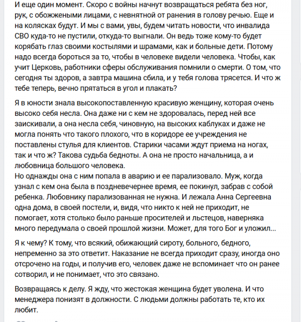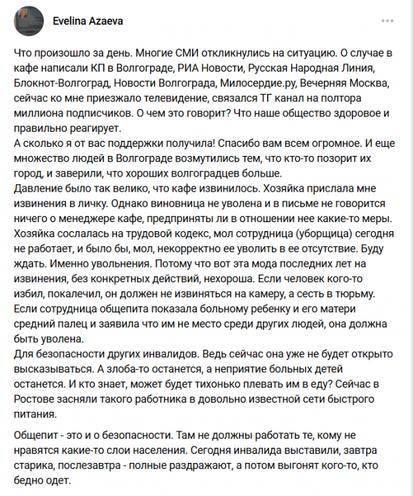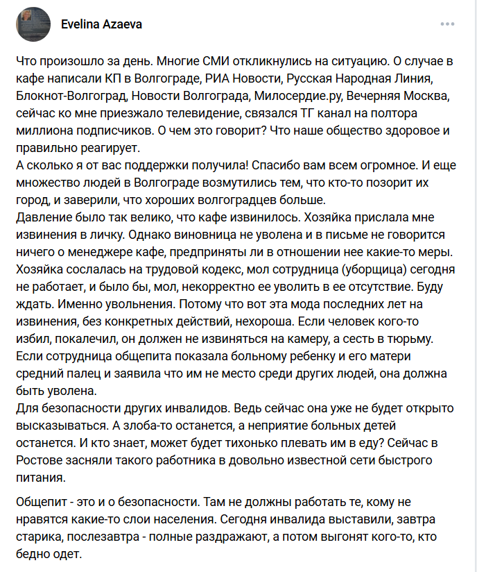 Заведение ранним утром было пустым, и пока мать ребёнка отошла, чтобы сделать заказ, девочка прилегла на диван. После этого к ней подошла сотрудница и, по словам родительницы, начала отчитывать девочку. Мать предупредила женщину, что у её ребёнка аутизм, но понимания не встретила. Ей было сказано, что с больными детьми не стоит ходить по кафе, а лучше лечиться в больнице. А вот в общественных заведениях им не место.Когда оторопевшая женщина попросила повторить на камеру всё, что ранее было сказано, ей показали средний палец. Эвелина Азаева говорит, что за сценой наблюдала и девушка из-за стойки, но совершенно ничего не сделала, а лишь заметила, что после поговорит с коллегой."Я в шоке, ребята. Удивила не уборщица с алкогольно-тюремной выправкой, а менеджмент. Руководителю было весело, что сотрудница выгоняет мать и ни в чем не повинного ребенка. Я во многих странах была, и нигде с таким не встречалась", - удивляется женщина, которая долгое время прожила за границей, была корреспондентом "Комсомольской правды" в Канаде.После инцидента Азаева посетила в областную администрацию, где оставила обращение на имя губернатора Волгоградской области. Сразу после этого руководство "ЖарПиццы" извинилось перед Эвелиной, прислав ей в личку письмо."Сегодня мы столкнулись с ситуацией, которую ни один родитель не хочет пережить, и, увы, эта история произошла в нашем кафе. Один из наших сотрудников грубо повел себя с Вами и Вашим ребенком. Нам крайне стыдно за произошедшее" ,- с таких слов начинался извинительный пост. Пиццерия подчеркнула, что случившееся идёт вразрез с их корпоративной культурой, и пообещала проработать с сотрудниками вопросы обслуживания инклюзивных клиентов."Вы заслуживаете искренних извинений за грубость сотрудника и его непонимание ситуации. Повторимся, данная ситуация недопустима, и мы призываем всех посетителей сообщать нам обо всех случаях плохого отношения персонала к клиентам. Только вместе мы сможем сделать наши пространства действительно доступными и уютными для каждого ребёнка и родителя", - говорится в обращении заведения. В качестве извинения пиццерия пригласила в гости Эвелину с дочкой, пообещав обслужить их по первому разряду. Также известно, что та самая работниц, возможно, будет уволена, в сейчас в "Жар Пицце" проходит внутренняя проверка. По данному факту проверка организована и прокуратурой области.Сама же Азаева благодарит неравнодушных людей за поддержку.