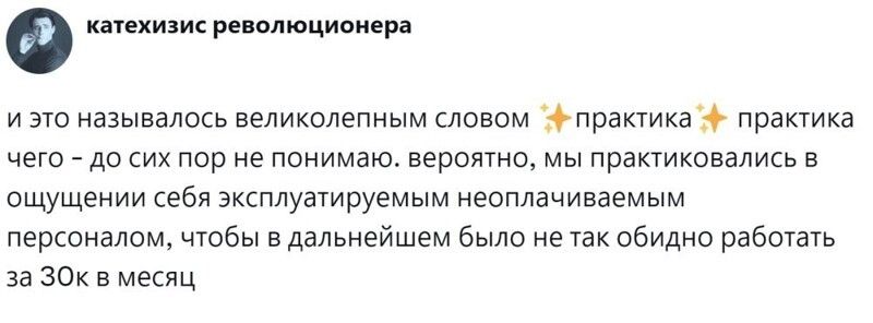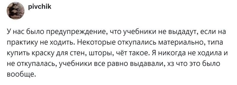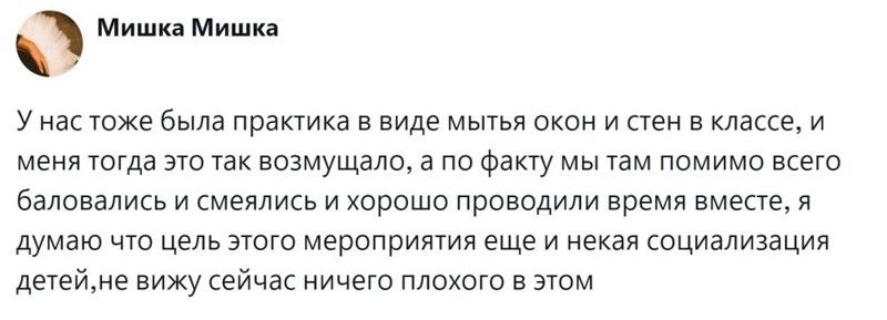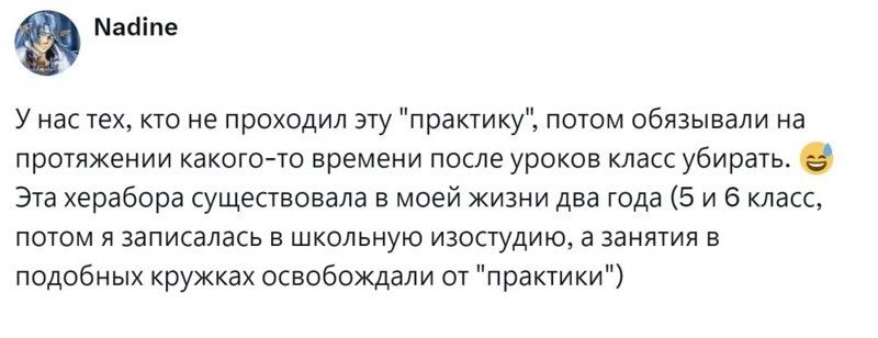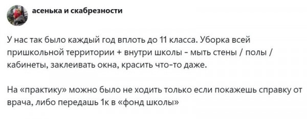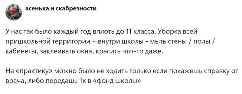 Но она омрачалась одним моментом - так называемой практикой в дни школьных каникул. Начиналась она со средней школы. Некоторым нужно было просто отметиться, другие приходили в библиотеку подклеить книги или прополоть клумбы возле школы. А третьих припахивали по полной программе: школьники белили деревья, делали ремонт в кабинетах и ездили на прополку всяких важных сельскохозяйственных культур. Пользователи поделились своей болью, связанной с практикой. А некоторые поностальгировали, рассказав, что больше баловались и общались, чем работали. И ничего такого страшного и трудного, о чём можно было бы поныть, в этот период не происходило.